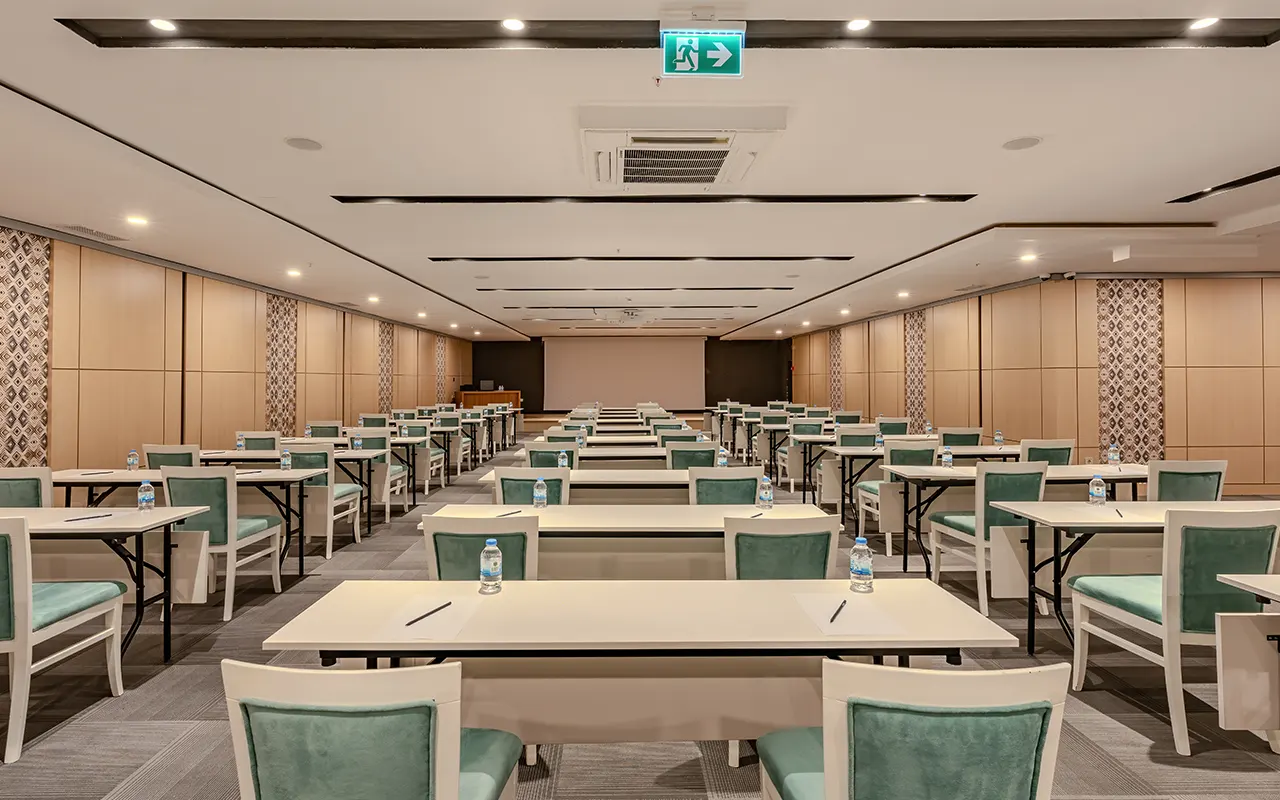 Projector, projection screen, wired microphone, wireless microphone, podium microphone, headset, flip chart, whiteboard marker, file and pen.